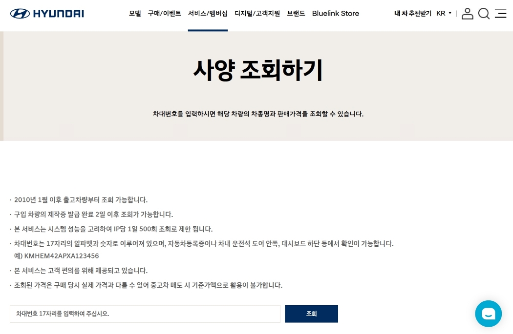 로그인을 마치면 드디어 '사양 조회하기' 페이지가 나타나요. 여기에 '차대번호 17자리를 입력하여 주십시오'라고 적힌 입력창이 보이시죠? 자동차등록증이나 운전석 쪽 대시보드에서 확인할 수 있는 17자리 차대번호를 정확하게 입력하고 '조회'를 선택하면 끝이에요. 2010년 1월 이후 출고된 차량부터 조회가 가능하다고 하네요.