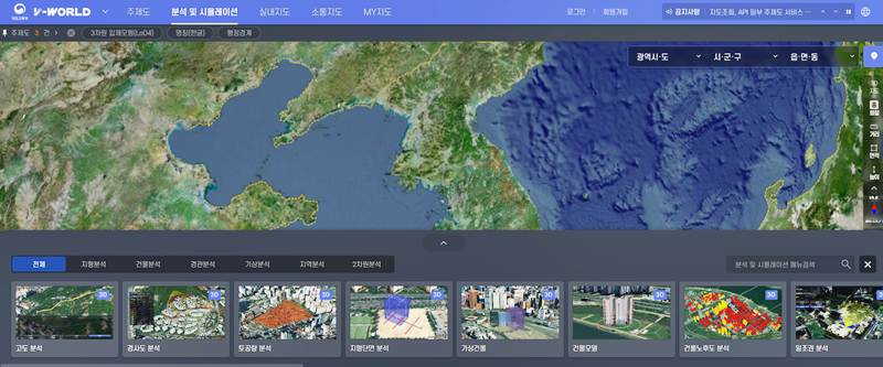 5. 분석 및 시뮬레이션 메뉴에서는 일조량, 조망권, 고도제한과 같은 주변경관 조회 분석 서비스 입니다. 고도분석, 경사도분석, 토공량분석, 지형단면, 분석, 가상건물, 건물모델, 건물노후도, 분석, 일조권 등을 확인 할 수 있습니다.