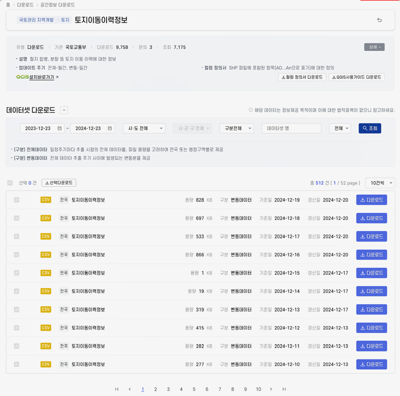 전체 데이터는 특정 추출 시점의 모든 정보를 포함하며, 변동 데이터는 그 사이 발생한 변경 사항만을 제공합니다. 데이터에는 컬럼 정의서가 포함되어 있어 각 항목에 대한 설명을 확인할 수 있으며 QGIS 사용 가이드를 통해 활용법도 안내받을 수 있습니다. 다만 이 데이터는 참고용으로 법적 효력은 없으니 유의하시기 바랍니다.