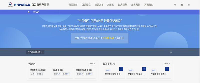 6. 오픈API는 공간정보 서비스 개발에 필요한 지도와 다양한 기능을 소스코드 형태로 제공합니다. 이를 통해 국가 공간정보를 개방하고 공유하며 누구나 창의적인 아이디어를 바탕으로 애플리케이션을 개발할 수 있는 환경을 제공합니다. 브이월드는 이러한 목표를 실현하기 위해 2D와 3D 지도 서비스, 검색 기능 등을 포함한 다양한 오픈API 기술을 제공 중 입니다