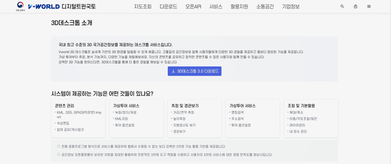 7. 3D데스크톱 메뉴는 국내 최고 수준의 3D 국가공간정보를 바탕으로 전문적인 분석 기능을 제공합니다. 경사도와 면적 측정부터 비행 시뮬레이션까지 다양한 기능을 통해 실세계 기반의 3D 환경을 볼 수 있습니다