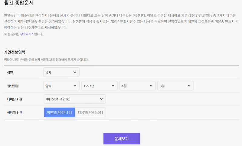 1. 단순히 개인의 운세만 알려주는 게 아니라 직업, 재물, 건강, 사랑 등 다양한 분야에 대한 예측과 조언을 제공해주기 때문에, 한 해를 어떻게 준비할지에 대한 계획을 세우는 데 큰 도움이 될 거예요. 무엇보다 이 서비스는 무료로 제공되니까 누구나 부담 없이 이용할 수 있어요. 그리고 디자인이 정말 직관적이고 간편해서, 운세를 확인하는 게 너무 쉬워요. 복잡하지 않아서 누구나 빠르게 확인할 수 있으니, 매번 찾아볼 때마다 편안하게 이용할 수 있어요. 먼저 2025 신토정비결부터 알아보겠습니다.
