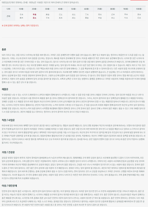 3. 대운은 10년 단위로 운세에 큰 변화가 일어나는 주기를 말합니다. 이 운세는 10살을 기준으로 시작되어, 이후 각 단계마다 중요한 변화가 생깁니다. 운세 결과는 양력 기준으로 제공되며, 총론을 통해 주요 운세와 함께 재물, 직장/사업, 가정/건강, 이성/대인관계에 대한 예측을 볼 수 있습니다.