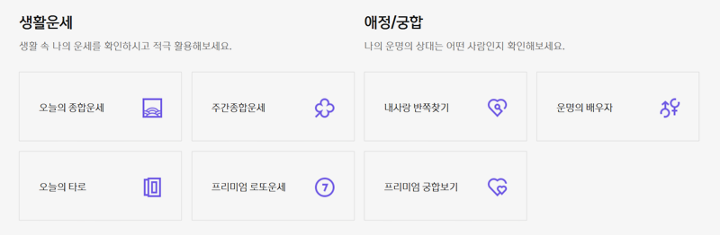 8. 이외에도 생활운세와 애정/궁합 운세도 볼 수 있는데 생활운세는 일상 속에서 쉽게 활용할 수 있는 운세 서비스를 제공합니다. 오늘과 주간의 종합운세, 타로 운세, 프리미엄 로또운세를 통해 매일의 운을 체크할 수 있어요. 또한 애정운과 궁합을 확인할 수 있는 서비스도 제공되어, 나의 운명의 상대나 배우자를 알아볼 수 있습니다. 간편하게 자신의 운세를 확인하고 중요한 일정을 준비하는 데 도움이 될 거예요.