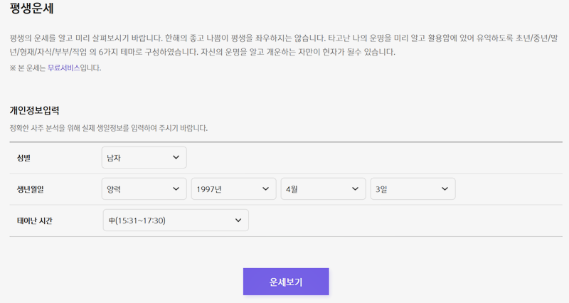 6. 평생운세 서비스를 통해 자신의 운명을 미리 살펴볼 수 있어요. 한 해의 운세가 평생을 좌우하진 않지만, 자신이 타고난 운명을 알면 더 잘 활용할 수 있겠죠. 이 서비스는 초년, 중년, 말년, 형제, 자식, 부부, 직업 등 6가지 테마로 나누어 운세를 보여줍니다.