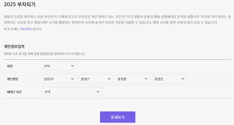 7. 2025 부자되기 서비스는 재물의 흐름을 정확하게 파악할 수 있는 특별한 사주 분석을 제공합니다. 오직 재물의 운용과 활용에 초점을 맞춰 진행됩니다. 부자가 되려면 그 시기를 잘 활용하는 것이 중요합니다. 그 시기를 알게 되면 여러분도 사주에 숨겨진 부자의 기운을 끌어낼 수 있어요. 때와 시기를 제대로 맞추면 부자의 길이 보일 거예요.