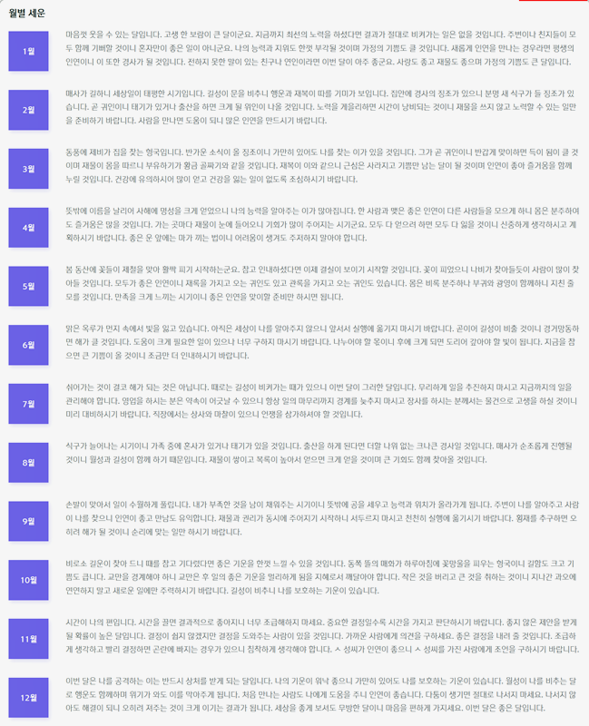 4. 또한 월별 세운을 통해 한 달 동안의 운세도 체크할 수 있어요. 각 항목은 간단하면서도 핵심적인 조언을 제공합니다.