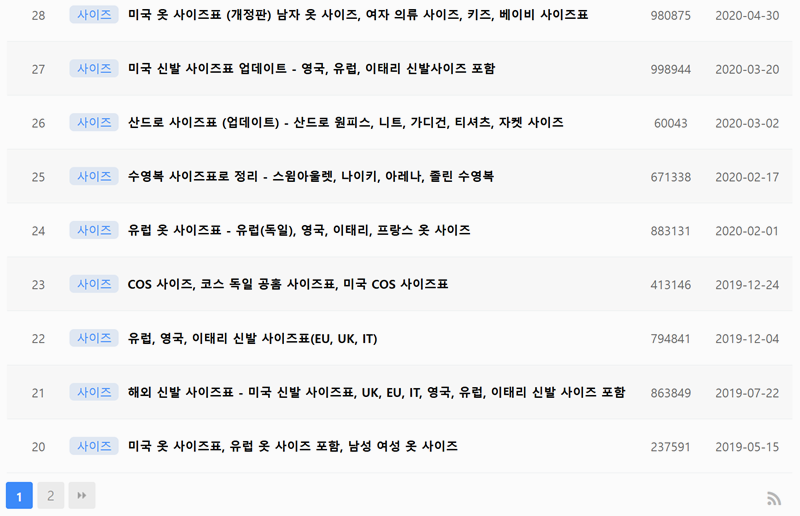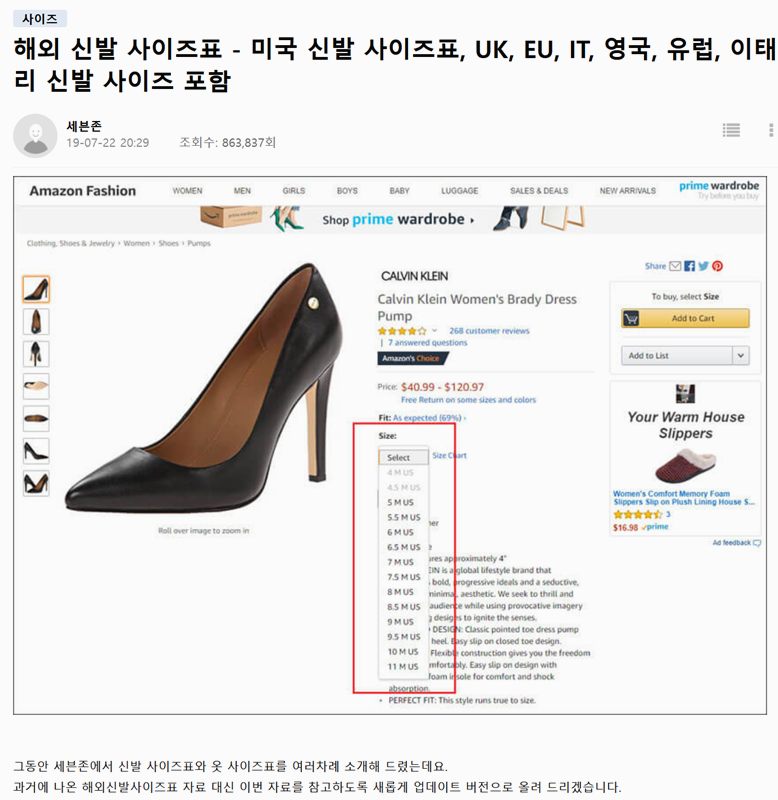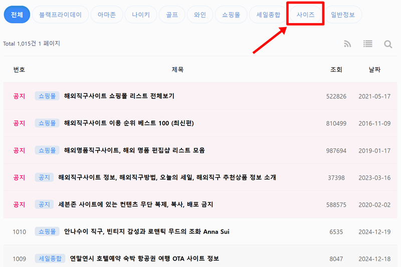 2. 해외직구 쇼핑정보에서는 블랙프라이데이, 아마존, 나이키, 골프, 와인, 쇼핑몰, 세일종합, 사이즈, 일반정보 등의 정보가 있습니다. 여기서 사이즈를 선택합니다.