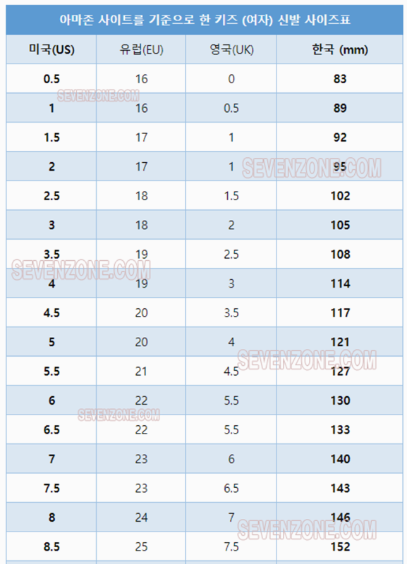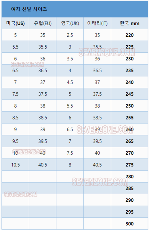서로 다른 국가나 지역에서 사용하는 신발 사이즈를 비교할 수 있도록 정리한 표입니다. 각국은 신발 사이즈를 측정하는 기준이 다르기 때문에, 같은 길이의 발에 대해 각기 다른 숫자나 단위를 사용합니다. 세븐존은 해외 직구 정보와 함께 미국, 영국, 유럽 등의 신발 사이즈표를 상세히 안내하고 있습니다.