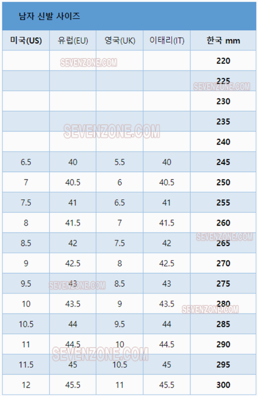 4. 제목 중 신발 사이즈표 제목을 눌러보았습니다. 계속해서 세븐존에서 업데이트 중이며 영국(UK), 유럽(EU), 프랑스(FR), 이탈리아(IT) 신발 사이즈 기준을 중심으로 정리되어 있습니다.