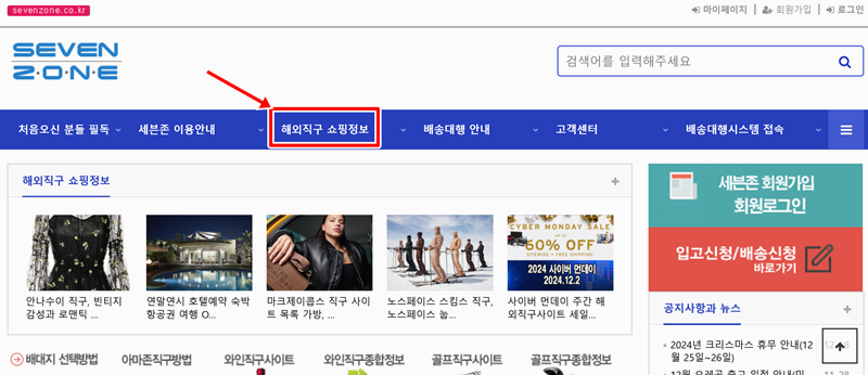 1. 세븐존은 2006년 미국 샌프란시스코와 실리콘밸리 지역에 직접 투자법인을 설립하여 온라인 마케팅과 배송대행 서비스를 제공해 온 해외직구 전문 플랫폼입니다. 해외직구 방법과 세계 신발 사이즈표 등 다양한 정보를 제공하는데요. 메뉴 중 [해외직구 쇼핑정보]로 들어갑니다.