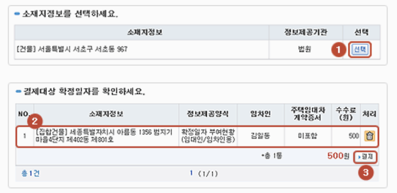 소재지 정보를 확인한 후, 조회하려는 항목 옆에 있는 [선택] 버튼을 눌러주세요. 그다음 선택한 확정일자 내역을 확인하고, 필요하면 결제대상에서 삭제할 수도 있어요. 모든 게 괜찮으면 [결제] 버튼을 눌러 결제 화면으로 가시면 됩니다!