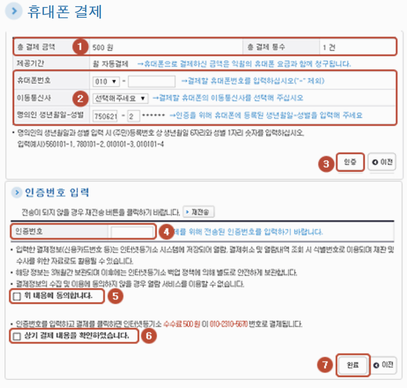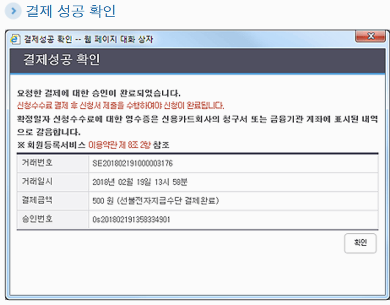 결제방법 선택 후 완료하면 성공 확인 창이 뜨며 승인번호를 확인 할 수 있습니다.