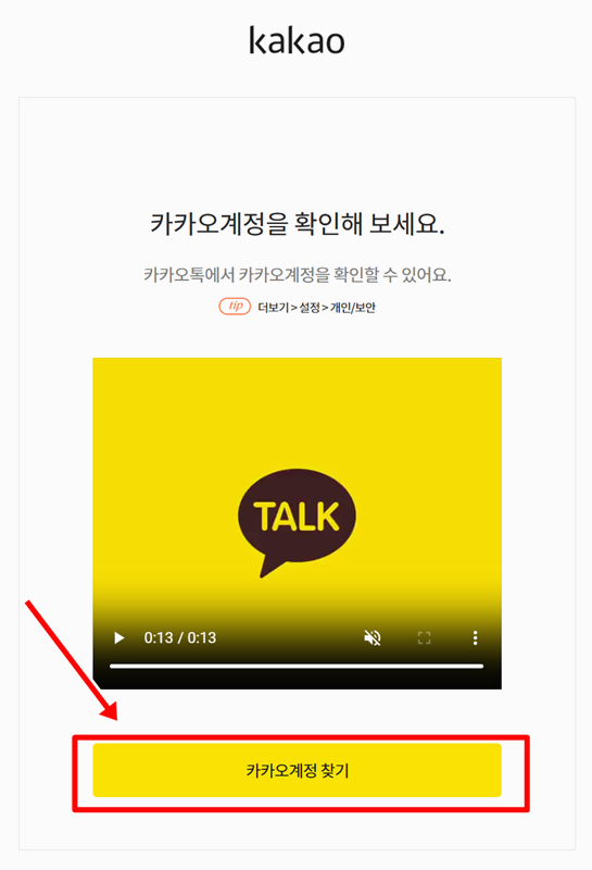3. 화면 아래쪽에 노란색 카카오계정 찾기 버튼이 보일 거예요. 여기서 한 번 더 선택해야 합니다.
