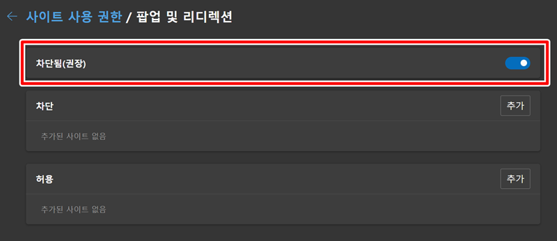 4. 팝업 및 리디렉션 설정 화면에서는 팝업 차단을 기본으로 할지 허용할지 선택할 수 있습니다. 기본적으로는 차단으로 설정되어 있지만 필요한 경우 변경할 수 있습니다. 팝업이 필요한 웹사이트를 자주 이용한다면 이곳에서 허용으로 설정해 두면 더 편리하게 사용할 수 있습니다.