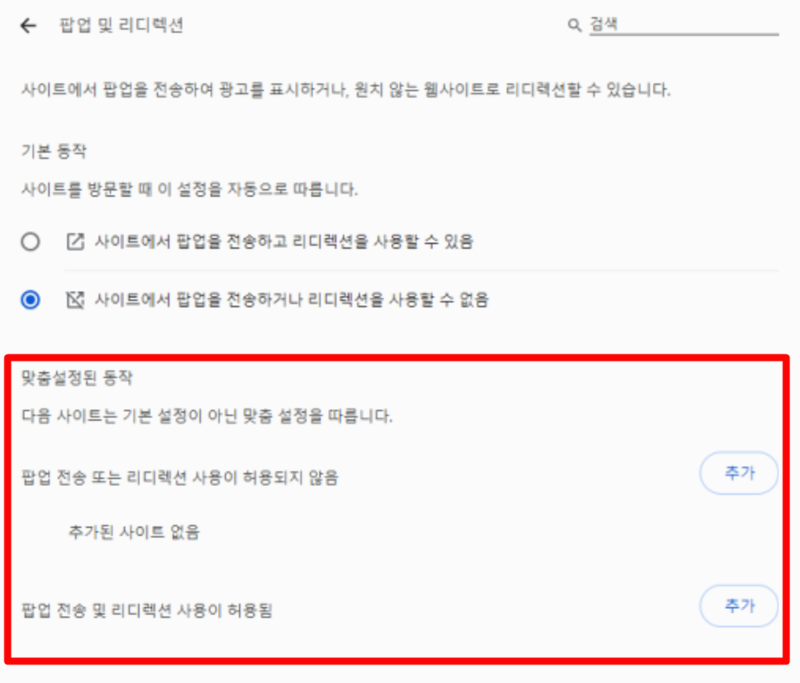5. 특정 웹사이트만 팝업을 허용하거나 차단하고 싶다면 화면 아래쪽의 맞춤설정된 동작 항목에서 설정할 수 있습니다. 여기에서 원하는 사이트를 추가하면 개별적으로 팝업 허용 여부를 정할 수 있습니다. 예를 들어 특정 사이트를 차단 목록에 넣으면 기본 설정과 상관없이 팝업이 막힙니다. 반대로 꼭 허용하고 싶은 사이트가 있다면 팝업 전송 및 리디렉션 사용이 허용됨 항목에서 추가하면 됩니다.