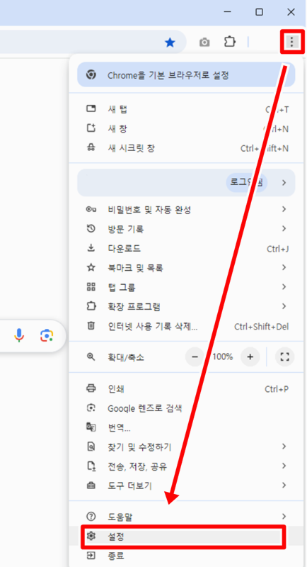 1. 크롬 브라우저에서 팝업 차단을 해제하려면 먼저 화면 오른쪽 위에 있는 점 세 개짜리 메뉴 아이콘을 눌러야 합니다. 이 아이콘은 크롬의 여러 설정을 변경할 수 있는 기능을 모아둔 곳입니다. 메뉴 아이콘을 누르면 여러 가지 항목이 나타나는데 설정을 선택합니다.
