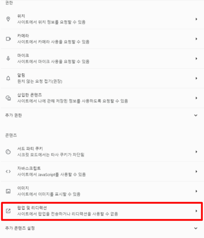 3. 화면을 아래쪽으로 내려보면 팝업 및 리디렉션이라는 항목이 있습니다. 이곳을 눌러 들어가야 팝업 차단을 해제할 수 있습니다. 이 메뉴에서는 웹사이트가 새 창을 띄우거나 다른 페이지로 이동하는 기능을 허용할지 차단할지 결정할 수 있습니다.