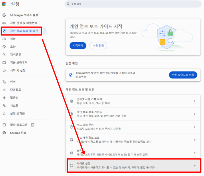 2. 설정 화면이 열리면 왼쪽에 여러 가지 메뉴가 보입니다. 여기에서 개인 정보 보호 및 보안 카테고리를 선택합니다. 이곳에서는 인터넷 사용 중 보안과 관련된 다양한 설정을 변경할 수 있습니다. 여기서 사이트 설정을 찾아야 합니다. 사이트 설정에는 웹사이트가 사용자의 브라우저에서 어떤 기능을 사용할 수 있도록 허용할지 결정할 수 있는 다양한 항목이 포함되어 있습니다. 이곳에서 팝업과 관련된 설정도 변경할 수 있습니다.