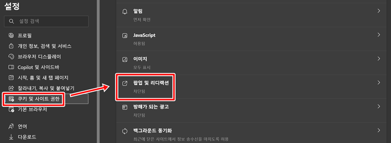 7. 설정 화면이 열리면 왼쪽 메뉴에서 쿠키 및 사이트 권한을 선택합니다. 이곳에서는 웹사이트가 브라우저에서 활용할 수 있는 여러 기능을 허용하거나 제한할 수 있습니다. 쿠키 및 사이트 권한 메뉴로 들어가면 여러 가지 설정이 보이는데 여기서 팝업 및 리디렉션 항목을 선택해야 합니다.