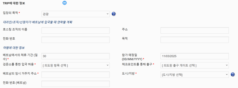 6. 베트남 체류와 관련된 세부 정보를 입력하는 과정이에요. 여행 목적을 선택하고 체류 일정을 정해야 해요. 입국할 공항이나 국경 검문소를 선택하고 출국 시 이용할 지점도 미리 정해야 해요. 체류할 숙소의 이름과 주소를 작성하고 베트남에서 사용할 연락처가 있다면 함께 적으면 돼요. 방문할 도시나 지역도 선택해야 하며 여행 일정과 맞게 작성하는 것이 좋아요.