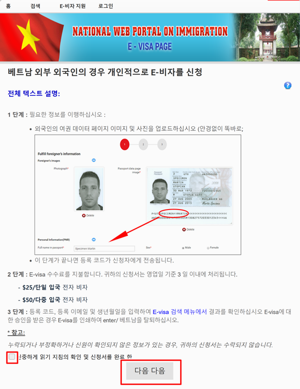 1. 여기는 베트남 e비자를 신청할 수 있는 공식 플랫폼입니다. 이곳에서는 필요한 서류를 제출하고 신청 과정을 간편하게 진행할 수 있습니다. 웹 브라우저의 번역기능을 활용하면 한글로 볼 수 있습니다. 안내사항을 잘 읽어보고 다음으로 넘어갑니다.