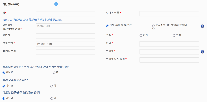 3. 신청자의 기본 정보를 입력하는 단계예요. 성명과 생년월일을 작성하고 출생지와 현재 국적을 선택해야 해요. 신분증 번호는 필수 사항이 아니라서 해당되는 경우에만 입력하면 돼요. 이메일 주소는 두 번 입력해 오류가 없는지 확인해야 하고 베트남 입국 기록이나 다른 국적 보유 여부 같은 추가 질문에도 본인 상황에 맞게 응답해야 해요.