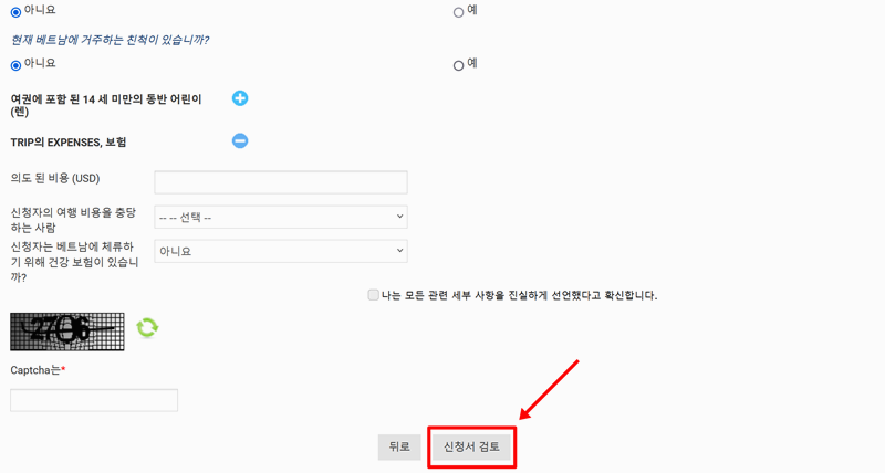 7. 마지막으로 모든 정보를 확인하고 신청서를 마무리하는 단계예요. 현재 베트남에 거주하는 친척이 있는지 여권에 포함된 동반 어린이가 있는지 여부를 입력해야 해요. 예상 여행 비용을 적고 비용을 부담하는 사람을 선택해야 해요. 건강 관련 보장 여부도 체크한 후 자동입력 방지 문자를 입력하면 돼요. 모든 사항을 확인한 후 신청서를 마무리하면 돼요.