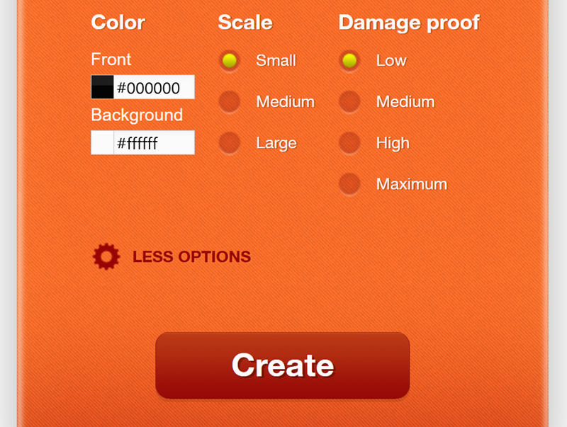 2. 'MORE OPTIONS' 버튼을 누르면 바코드의 색상, 크기, 내구성을 설정할 수 있습니다. color에서 바코드와 배경 색상을 변경할 수 있으며 scale에서는 크기를 조절할 수 있습니다. damage proof는 오류 복원 수준을 설정하는 항목으로 낮음부터 최대까지 선택할 수 있습니다. 설정을 마친 후 create 버튼을 누르면 바코드가 생성됩니다.