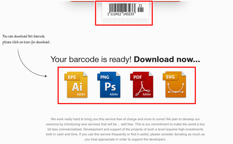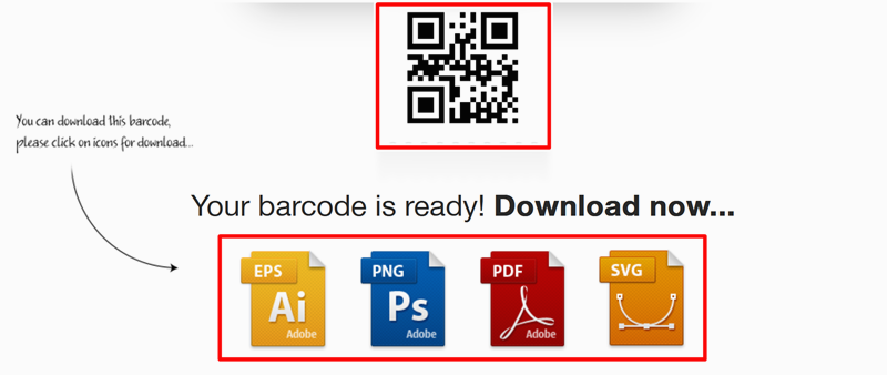 3. 생성된 바코드는 다양한 파일 형식으로 저장할 수 있습니다. EPS, PNG, PDF, SVG 형식으로 제공되며 원하는 아이콘을 선택하면 해당 파일로 내려받을 수 있습니다. 벡터 파일 형식도 포함되어 있어 인쇄나 디자인 작업에도 유용하게 활용할 수 있습니다.