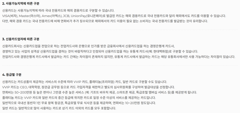 2. 쓰는 지역 발급 회사 등급에 따라 나뉘어요. 국내 해외 사용 여부 회사 종류 등급별 혜택을 따져보고 자신에게 맞는 걸 고르는 게 좋죠. 특히 해외에서 자주 쓰거나 특정 회사의 혜택을 많이 받는다면 그에 맞는 걸 고르세요.
