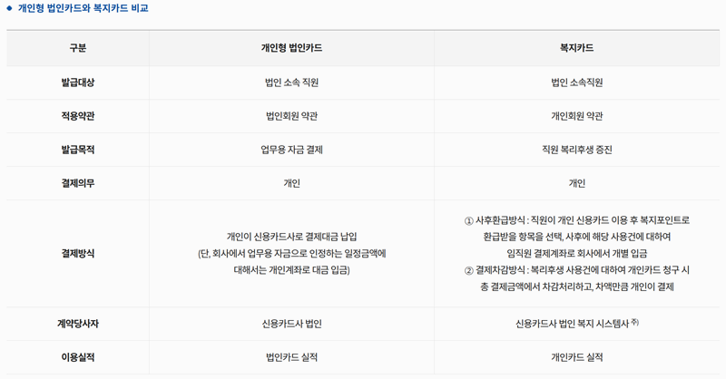 4. 개인,법인용,복지용은 직원 대상이지만 약관 목적 결제 방식 등이 달라요. 법인용은 업무용 복지용은 직원 복지용이고 계약 당사자도 다르니 계약 조건을 잘 알아봐야 해요.
