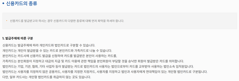 1. 신용카드를 만들 때는 어떤 종류가 있는지 꼼꼼히 살펴보는 게 좋아요. 개인용은 본인과 가족이 쓰고 법인용은 회사에서 쓰는데 법인용은 카드사마다 종류가 다를 수 있으니 각 회사별로 알아보는 게 좋겠죠.