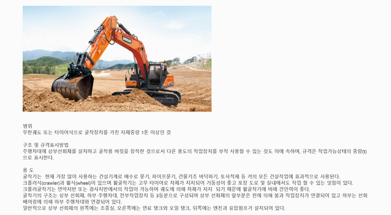 8. 굴착기는 건설 현장에서 가장 널리 사용되는 장비로 배수로 작업, 파이프 매설, 건물 기초 공사 등에 효과적입니다. 크롤러식과 휠식이 있으며 휠식은 기동성이 뛰어나 포장도로에서도 작업할 수 있고 크롤러식은 지반이 약한 곳이나 경사진 곳에서도 안정적으로 사용할 수 있습니다. 상부 선회체, 하부 주행차대, 작업장치로 구성되며 다양한 부착 장치를 사용할 수 있어 활용 범위가 넓습니다.