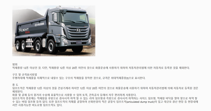 3. 덤프트럭은 적재물을 자체적으로 하역할 수 있는 건설기계로 토목과 건축공사에서 널리 쓰입니다. 적재 용량 12톤 이상이 해당하며 하역 방식에 따라 리어 덤프형, 사이드 덤프형, 버텀 덤프형 등으로 구분됩니다. 또한 좁은 공간에서 기동성이 좋은 굴절식 덤프트럭과 대규모 현장에서 활용되는 비도로형 덤프트럭도 있습니다.