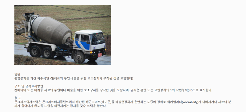5. 콘크리트 믹서 트럭은 생콘크리트를 타설 현장까지 운반하면서 균일한 상태를 유지하도록 드럼을 회전시키는 장치를 갖춘 건설기계입니다. 자주식이며 재료 투입과 배출을 돕는 장치가 부착될 수 있으며 한 번에 혼합할 수 있는 용량으로 규격이 표시됩니다. 건설 현장에서 콘크리트 품질을 유지하며 원활한 작업을 돕는 역할을 합니다.
