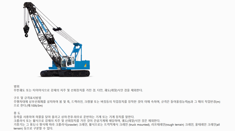 4. 기중기는 무거운 하물을 들어 올려 이동시키는 건설기계로 강재 지주와 선회 장치를 갖춘 것이 해당됩니다. 주행차대 위에 회전하는 상부 구조와 작업 장치를 장착하며 하중을 들어 올릴 수 있는 능력과 작업 반경에 따라 규격이 정해집니다. 종류에 따라 크롤러식, 트럭적재식, 러프테레인, 올테레인 크레인 등으로 구분되며 건설과 하역 작업에서 폭넓게 활용됩니다.
