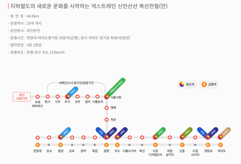 4. 신안산선 복선전철 노선도도 확인 할 수 있습니다. 총 연장은 44.9km이며 19개 역을 연결합니다. 열차는 유인 운전 방식으로 운행되며 급행과 일반 열차가 함께 운행됩니다. 한양대에서 여의도까지 급행 기준 약 20분, 일반 열차는 약 40분이 걸립니다. 최고 속도는 110km/h로 빠른 이동이 가능합니다. 또한 광명역, 영등포역 등 주요 환승역이 포함되어 있어 다른 노선과의 연계도 수월합니다.