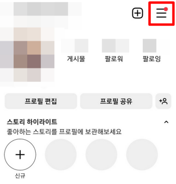 5. 이번에는 스토리를 통해 방문 기록을 확인하는 방법을 알아보겠습니다. 내 프로필 화면에서 오른쪽 상단에 있는 세 줄 메뉴를 누르면 여러 가지 설정이 나타납니다. 여기에서 방문자 확인과 관련된 기능을 찾을 수 있습니다.