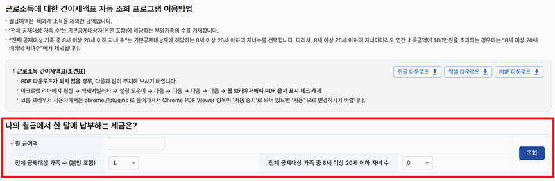 4. 근로소득 간이세액표를 자동으로 조회하려면 비과세 소득을 제외한 월급여액과 공제대상 가족 수를 입력해야 합니다. 8세 이상 20세 이하 자녀라도 일정 소득을 넘으면 공제 대상에서 빠집니다.