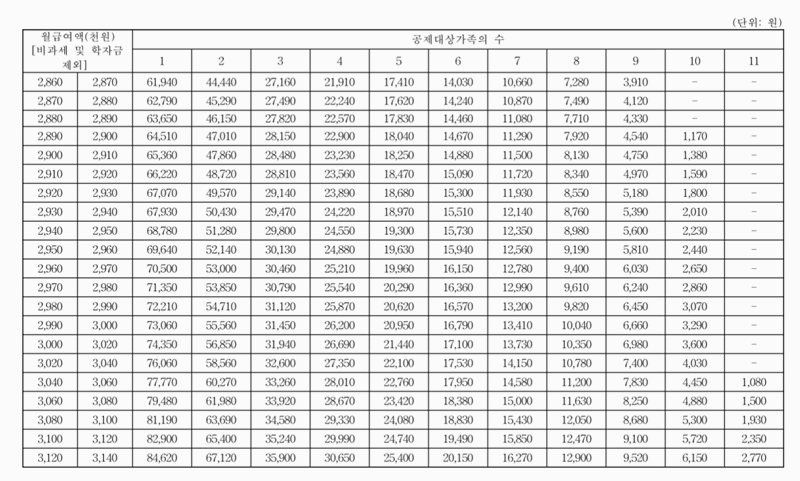 6. 근로소득 간이세액표를 한글/엑셀/pdf 등으로 내려받으면 월급에 따라 원천징수되는 소득세와 지방소득세를 확인할 수 있습니다. 또한 공제대상 가족 수에 따라 세금이 어떻게 조정되는지도 볼 수 있습니다. 한 달에 납부해야 할 세금을 미리 계산하고 연말정산 시 추가 납부나 환급 가능성을 예상할 수 있습니다.