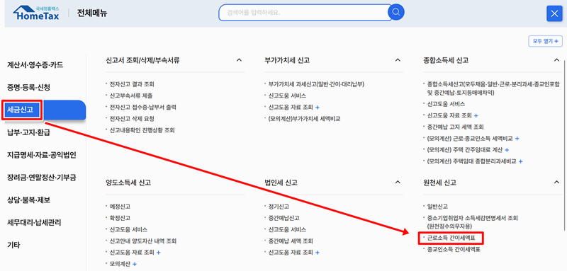 2. 그리고 전체메뉴가 열리면 세금신고 카테고리에서 원천세 신고의 ‘근로소득 간이세액표’로 이동합니다.