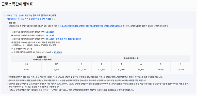 3. 2024년 3월 1일부터 근로소득 간이세액표가 변경되어 자녀가 있는 경우 세금 부담이 줄어듭니다. 8세 이상 20세 이하 자녀가 있을 때 자녀 수에 따라 일정 금액을 세금에서 차감하며 공제 후 금액이 0원보다 적으면 세금을 내지 않습니다. 원천징수세액은 급여와 부양가족 수를 기준으로 결정되며 필요에 따라 조정할 수도 있습니다.