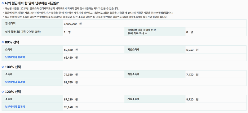 5. 계산을 누르면 간이세액표 조회로 근로소득세와 지방소득세 결과를 확인 할 수 있는데요. 월급에서 원천징수되는 세금은 간이세액표를 기준으로 하지만 실제 공제 금액과 차이가 날 수 있습니다. 연말정산을 통해 정확한 세금을 정산하며 추가 납부나 환급이 발생할 수도 있습니다.