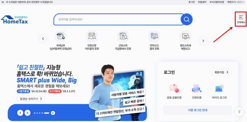 1. 세금과 관련된 다양한 업무를 온라인으로 편리하게 처리할 수 있는 곳입니다. 세금 신고, 납부, 조회뿐만 아니라 근로소득세 자동계산도 할 수 있습니다. 따로 방문할 필요 없이 집이나 직장에서 쉽게 이용할 수 있어 많은 사람이 활용하고 있습니다. 화면 우측에 있는 전체메뉴를 눌러줍니다.