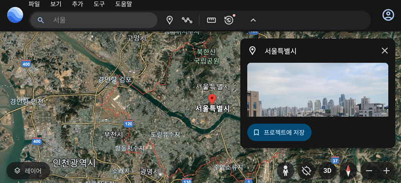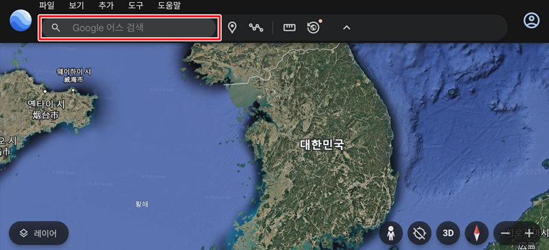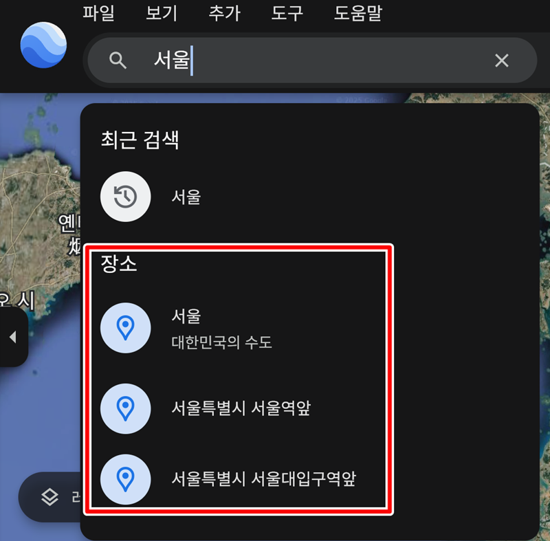 2. 화면 왼쪽에 있는 검색창에서 보고 싶은 위치를 입력하면 됩니다. 최근에 찾았던 장소와 검색 기록도 함께 확인할 수 있어 자주 찾는 곳을 쉽게 다시 볼 수 있습니다. 원하는 지역을 입력하면 바로 해당 위치로 이동해 위성사진을 확인할 수 있습니다.