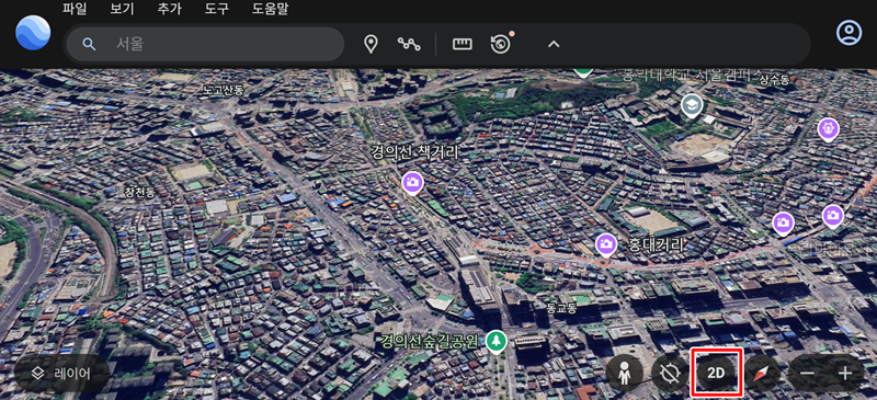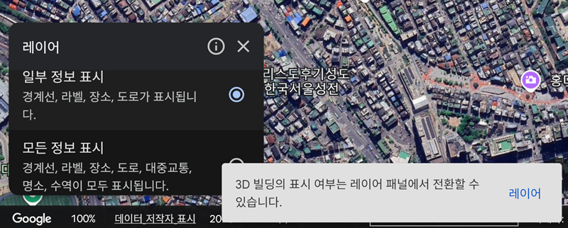 6. 화면 왼쪽 아래에 있는 레이어 설정을 통해 다양한 정보를 추가할 수 있습니다. 경계선, 도로, 대중교통, 명소, 수역 등 다양한 요소를 지도 위에 표시할 수 있으며, 3D 건물 표시 여부도 여기에서 설정할 수 있습니다.