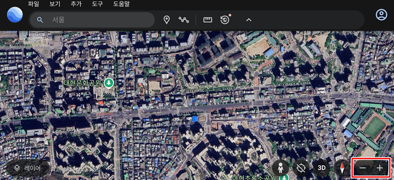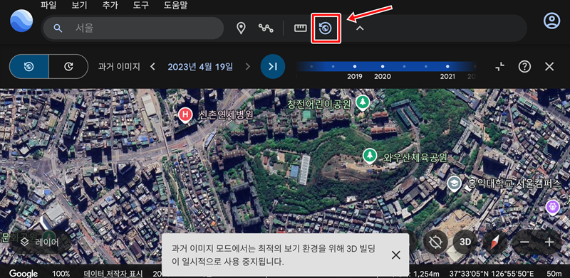 7. 화면 상단에 있는 과거 이미지 보기 기능을 활용하면 예전 위성사진을 확인할 수 있습니다. 특정 지역이 시간이 지나면서 어떻게 변했는지 비교해 볼 수도 있습니다. 다만 과거 이미지에서는 3D 건물 표시 기능이 활성화되지 않습니다.