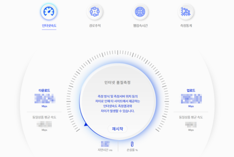 1. 별다른 설정 없이 접속하는 것만으로 속도를 측정할 수 있어 누구나 쉽게 사용할 수 있습니다. 결과는 다운로드 및 업로드 속도와 지연 시간까지 보여줘서 인터넷 상태를 한눈에 파악할 수 있습니다. 처음 사이트로 들어오면 바로 측정이 시작 됩니다.