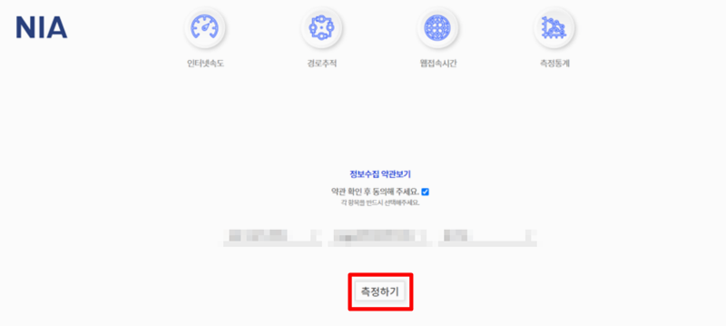 7. 프로그램 설치 후 정보수집 약관에 동의를 한 후 통신사 및 요금, 지역 등을 선택하고 측정하기를 하면 다운로드/업로드/핑 속도를 한번에 보여줍니다.